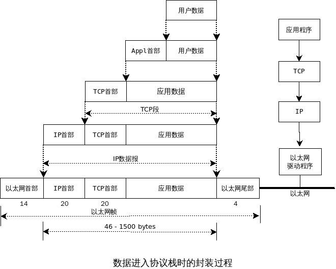 当应用程序用TCP传送数据时,数据被传送入协议栈中,然后逐一通过每一层直到被当作一串比特流送入网络