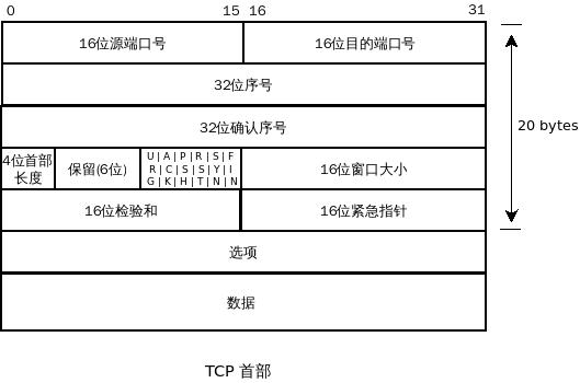 32-bit字的数目。这个值存在是由于选项字段的长度是可变的,这个字段占4bit,所以TCP最多有60字节的首部,没有选项字段,正常长度是20字节。 - 6 个标志位
